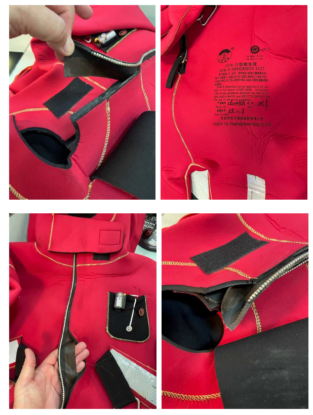 The examiners noted several issues such as unsealed seams, defective zipper, immersion suits found in bad condition. Such failures will prevent the suit from achieving a water-tightness and their poor conditions will present serious risk to crewmembers in a survival situation.