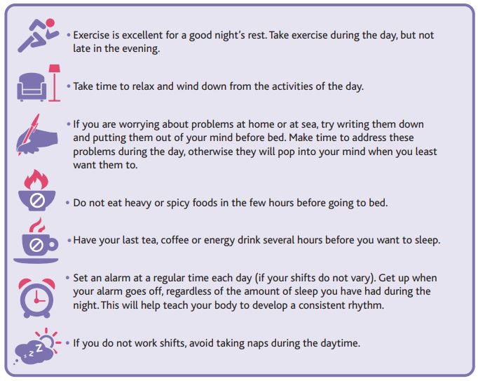 Our bodies are naturally aligned to wakefulness during the daylight hours and sleep during the hours of darkness. Using light and dark can help you to get a better sleep even if your shift patterns mean that you have to be alert during the normal night hours.When you want to be awake and alert use bright lighting – daylight bulbs if they are available or open the curtains and let the sunlight in, during hours of daylight. Use blackout blinds or curtains in the period before and during sleep and dim the lighting in your cabin. If your cabin still isn’t dark enough, try to prepare ahead and bring an eye mask with you on your next voyage.