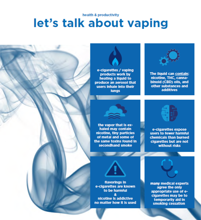 It’s recognizes that vaping can help smokers who are trying to quit however other associated risks should be taken to consideration. Remember there is still little information about the long-term effects of vaping.