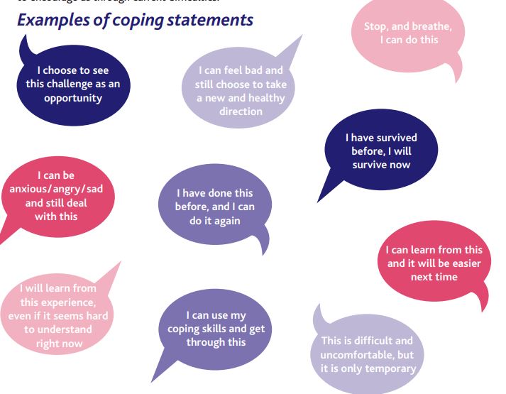 Choose words that work for you.Write down a coping thought or positive statement for each difficult or distressing situation. Tell yourself something that will help you get through.Write them down on a piece of card and carry it in your pocket to help remind you.