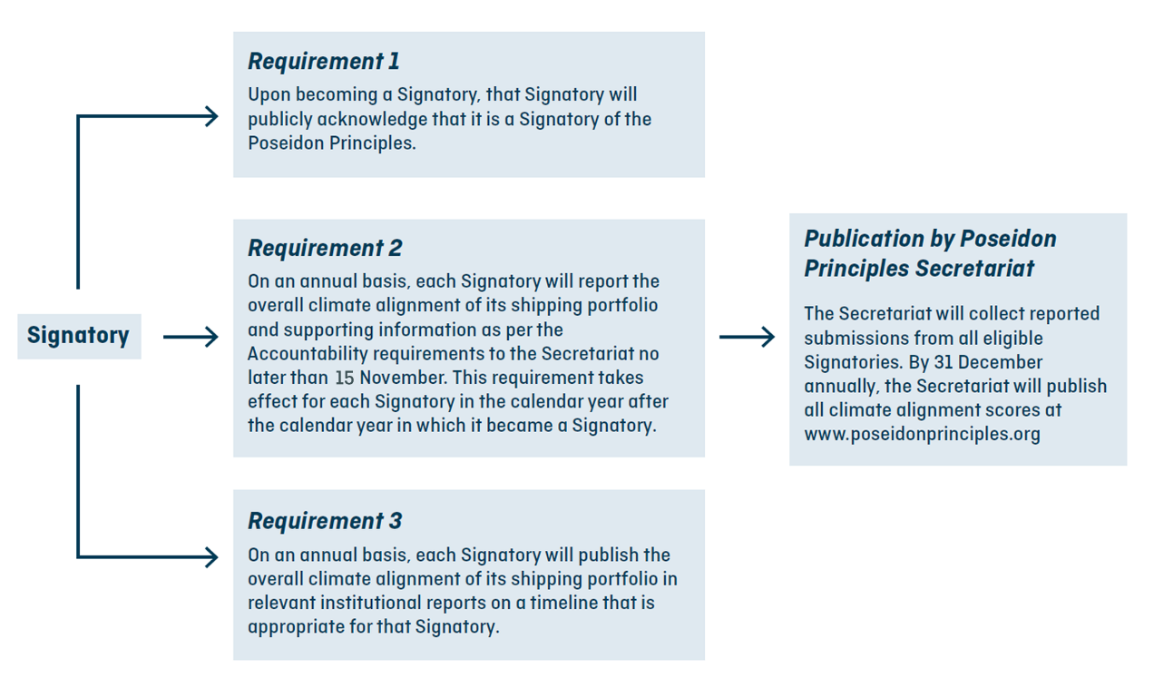 Signatories are required to report their portfolio alignment score on an annual basis. All Signatories’ scores will be published annually by the Secretariat of the Poseidon Principles.