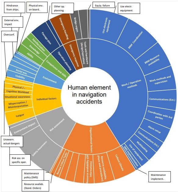 Around 78% of the investigated navigation accidents is somehow linked to “human action”. The document goes beyond the face value of this figure and focuses on the complexity behind the human error, especially when the actions of the Master or OOW are scrutinised and demonstrates that the variability of the key actors’ performance is not the explanatory cause of the marine casualty.