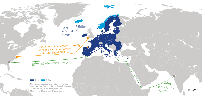 All 100% of emissions on voyages and port calls within the EU/EEA, and 50% of emissions on voyages into or out of the EU/EEA, are subject to the EU ETS. To avoid evasive behaviour, container ships stopping in transshipment ports outside the EU/EEA but less than 300 nm from an EU/EEA port, need to include 50% of the emissions for the voyage to that port as well, rather than only the short leg from the transshipment port. The EU will provide a list of transshipment ports.