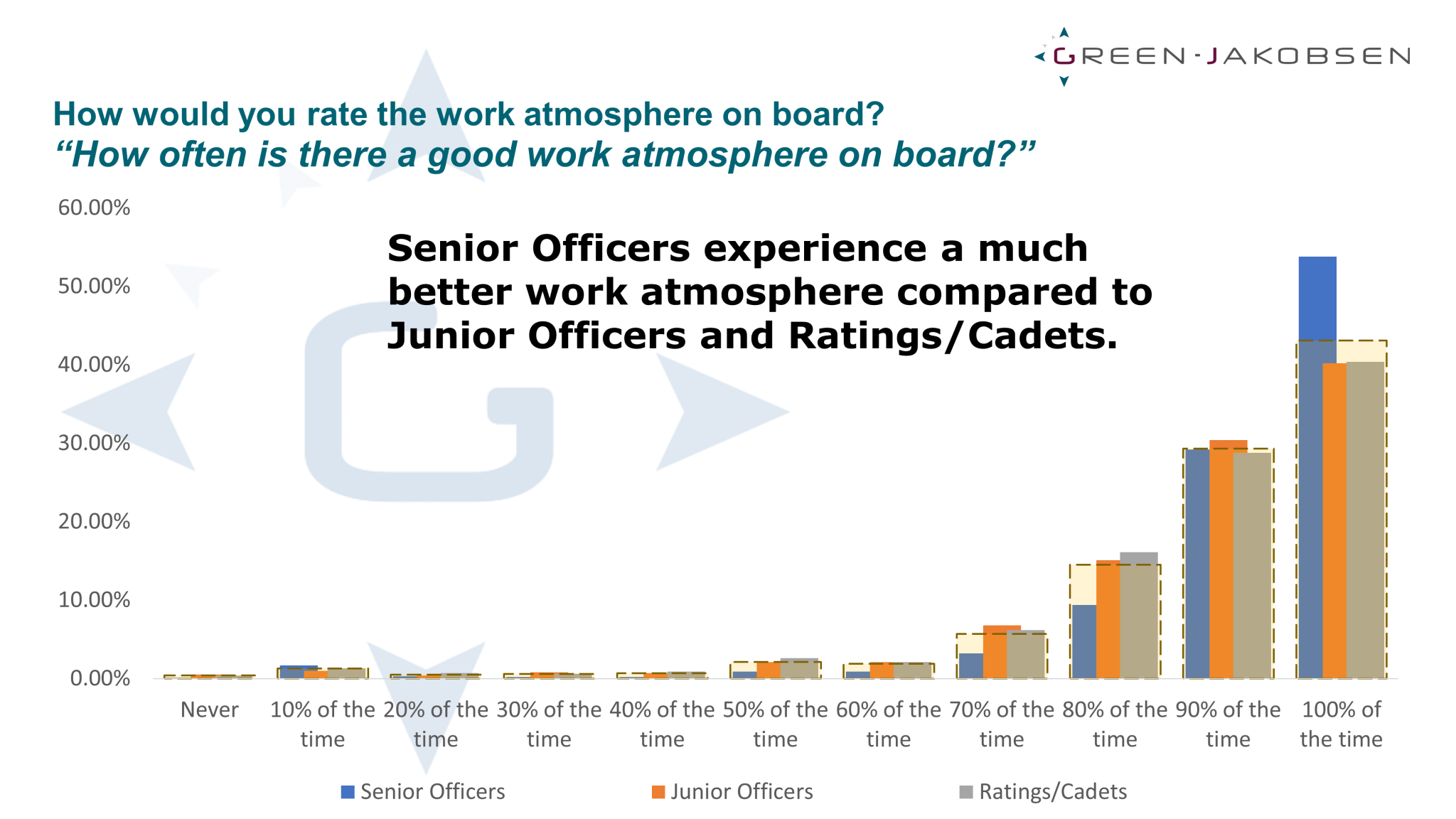 One of the interesting findings from the performance survey responses is that when asked, “How often is there a good work atmosphere on board?”, Senior Officers indicate experiencing a much better work atmosphere compared to Junior Officers and Ratings/Cadets.
