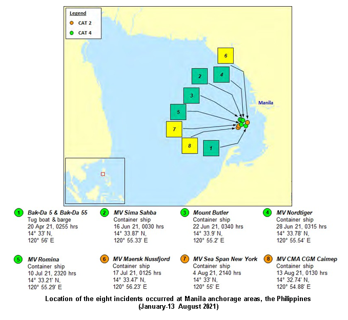 During January-August 2021, a total of eight incidents of armed robbery against ships occurred at Manila Anchorage areas in the Philippines. The location of all the eight incidents is at South Harbour Anchorage Area of Manila.