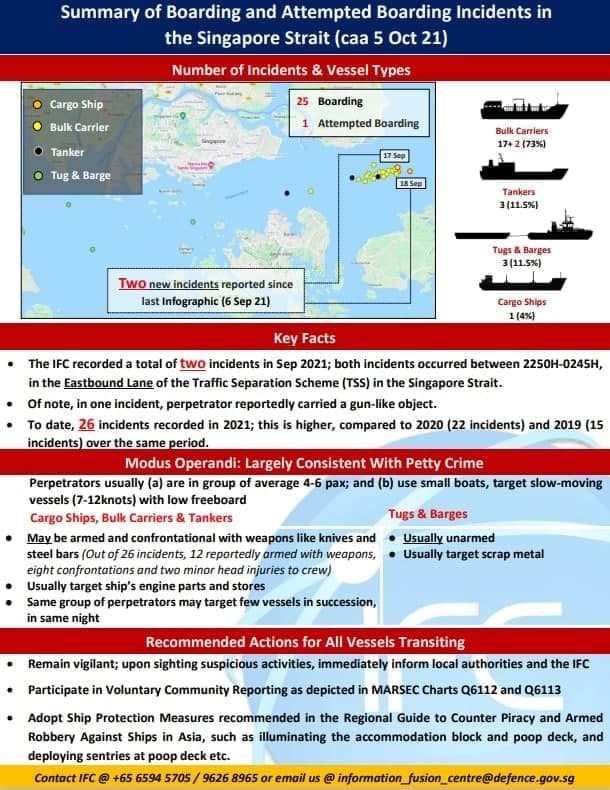 Information Fusion Centre (IFC) released its latest infographic, providing an overview of incidents against ships in the Singapore Strait as of 5 October 2021.