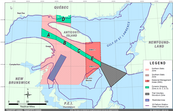 On 10 March 2022, Transport Canada (TC) announced the vessel traffic management measures that will be enforced in the Gulf of St. Lawrence during the 2022 whale season, which this year extends from 20 April to 15 November. The following restrictions apply to all vessels more than 13 m in overall length (OAL):