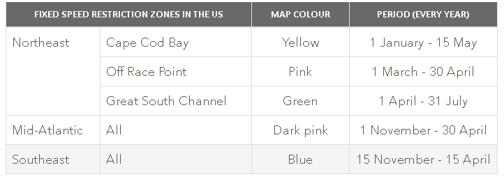 - In the Northern and Southern Static Zones, shown in pink in the map below, a fixed mandatory speed restriction of maximum 10 knots is in force during the entire whale season.