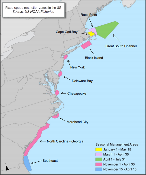 - Fixed speed restriction zones: All vessels 65 feet (19.8 m) in OAL or more must travel at 10 knots or less in certain locations, referred to as seasonal management areas (SMAs), along the US East Coast at certain times of the year. An overview of the SMAs are shown in the map below and additional details are provided in NOAA’s “Compliance Guide”.