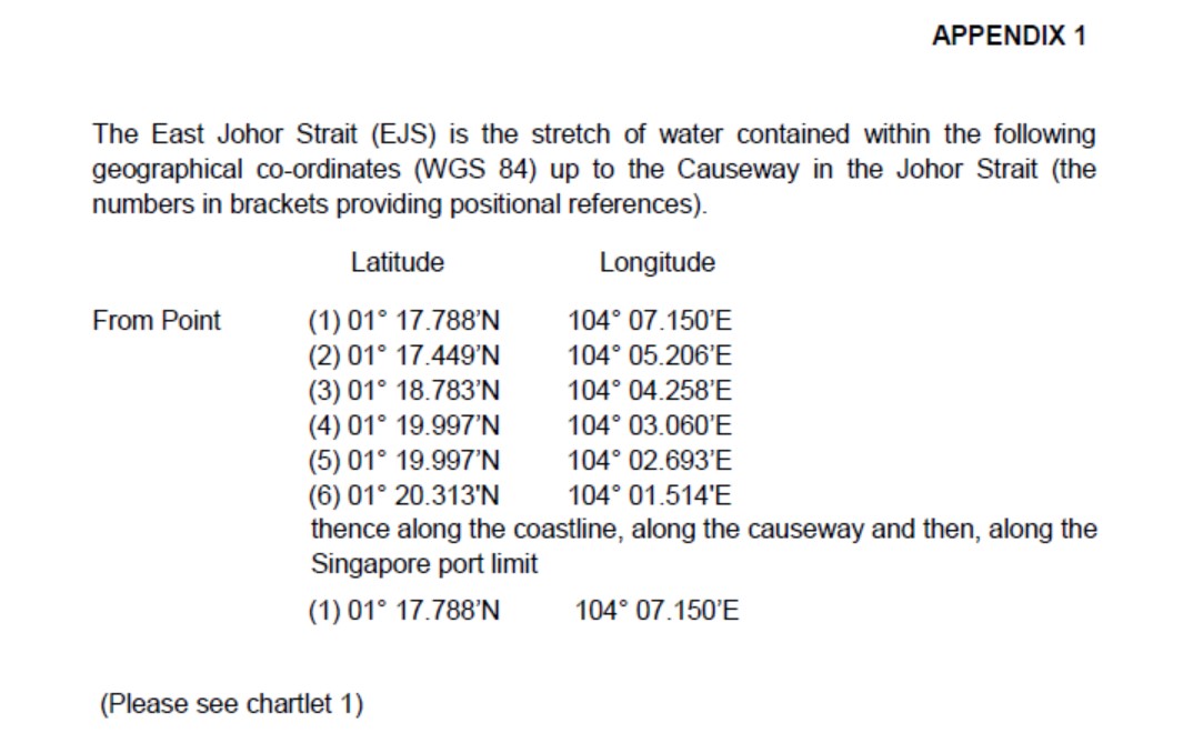 - East Johor Strait (EJS) – the stretch of water contained within the geographical co-ordinates shown in Appendix 1 up to the Causeway in Johor Strait.
