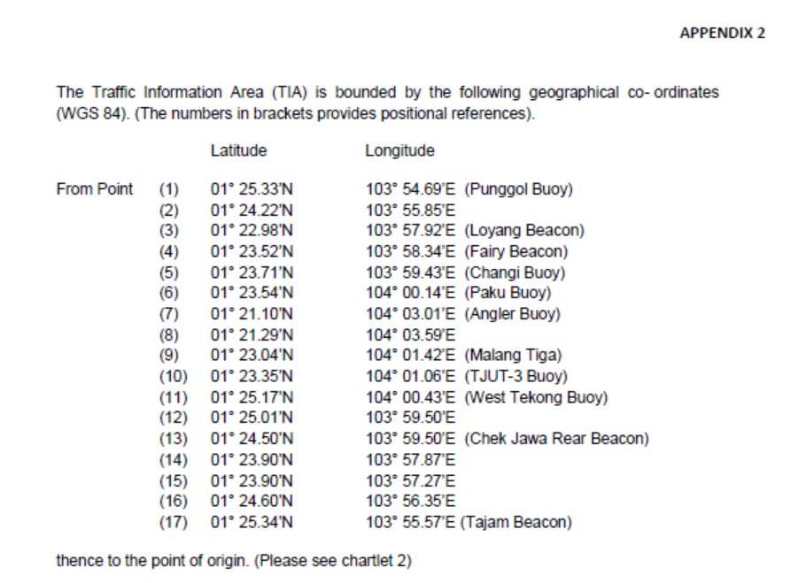 - Point 1 Lat. 1° 22.42’N Long. 104° 01.93’E (WGS 84);