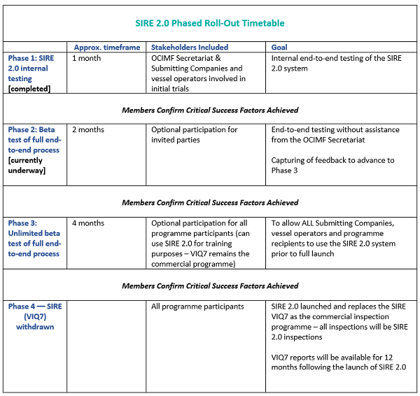 All companies engaged in the SIRE programme will be provided with ample notice before Phase 3 is activated. Phase 3 will provide all programme participants with the opportunity to conduct SIRE 2.0 inspections for familiarisation and testing purposes, however VIQ7 will still be used as the commercial inspection programme throughout Phase 3.