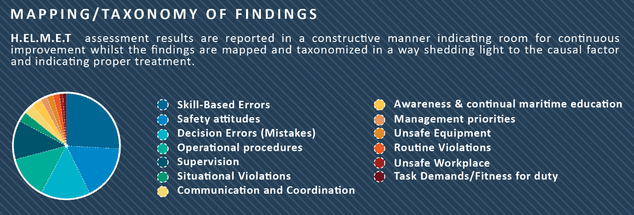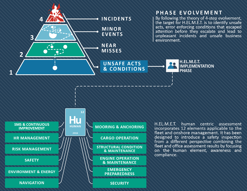 H.EL.M.E.T. is a continuous compliance program and represents a simple, practical and effective methodology for risk assessment. It incorporates the development and conduction of an assessment aiming towards the combined evaluation of the condition and the identification of potential human-born failures targeting optimisation of the human element in the maritime industry.