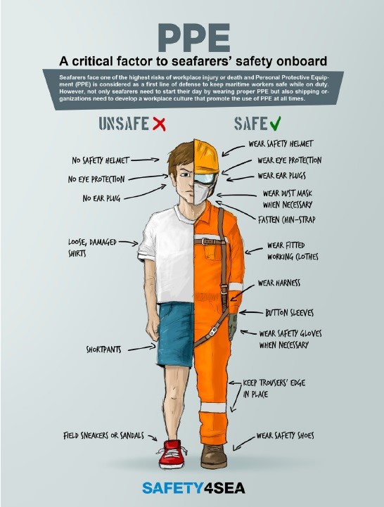 Seafarers face one of the highest risks of workplace injury or death and Personal Protective Equipment (PPE) is considered as a first line of defense to keep maritime workers safe while on duty. However, not only seafarers need to start their day by wearing proper PPE but also shipping organizations need to develop a workplace culture that promote the use of PPE at all times.