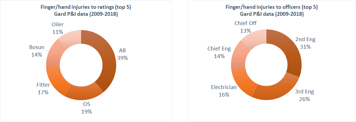 Data from our P&I portfolio for the years 2009 – 2018 shows that over this ten year period some 25% of all crew injury claims are finger/hand injury related. The data also shows that ratings are nearly twice as likely to suffer from such injuries compared to officers. Amongst ratings, the majority of finger/hand injuries happen to able bodied seamen (AB). For officers, marine engineers (second engineer, third engineer and electrician) are most vulnerable. In terms of costs, 15% of all the crew injury claims can be attributed to finger or hand injuries.