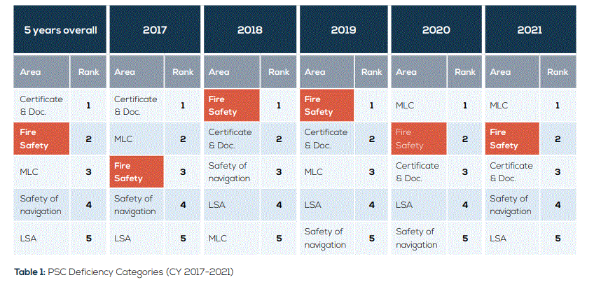 Fire Safety is a key area of concern during PSC inspections. It is widely known that fire is one of the worst case scenarios for an on board emergency. PSC data analysis from the last five years shows that there is a lot of concern for onboard fire safety while ships have still several issues to address in this area.
