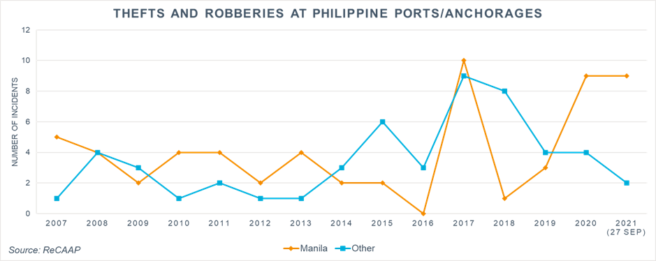 According to the Regional Cooperation Agreement on Combating Piracy and Armed Robbery against Ships in Asia Information Sharing Centre (ReCAAP ISC), a total of 11 incidents of armed robbery against ships has been reported in the Philippines so far in 2021. Nine of the 11 incidents occurred at Manila Anchorage Areas. All nine took place during the hours of darkness, and seven of the nine involved a container vessel.
