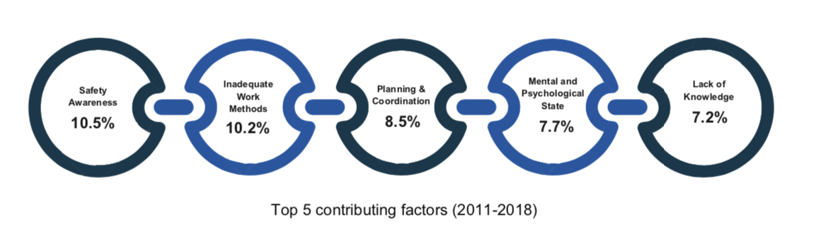 According to the European Maritime Safety Agency (EMSA) 2019 report on “Annual overview of marine casualties and incidents 2019”, 2 out of 3 of all incidents (between 2011 to 2018) were contributed by human factors. The top factors include (1) 10.5% -lack of safety awareness, (2) 10.2% -inadequate work methods, and (3) 8.5% -poor planning and coordination.