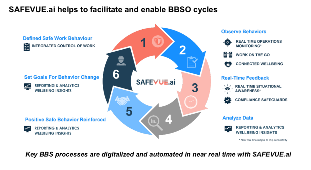 Most of the fundamental pillars of BBS can be managed through the solution. With the availability of wearables for every crew member, crucial information with regards to the working conditions, hazard exposure periods, and other work-related hazards faced by the crew can be detected.