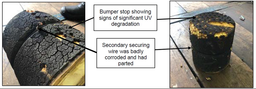 - the vulcanised rubber section of the bumper stop had deteriorated to an unstable condition and detached from the securing plate;