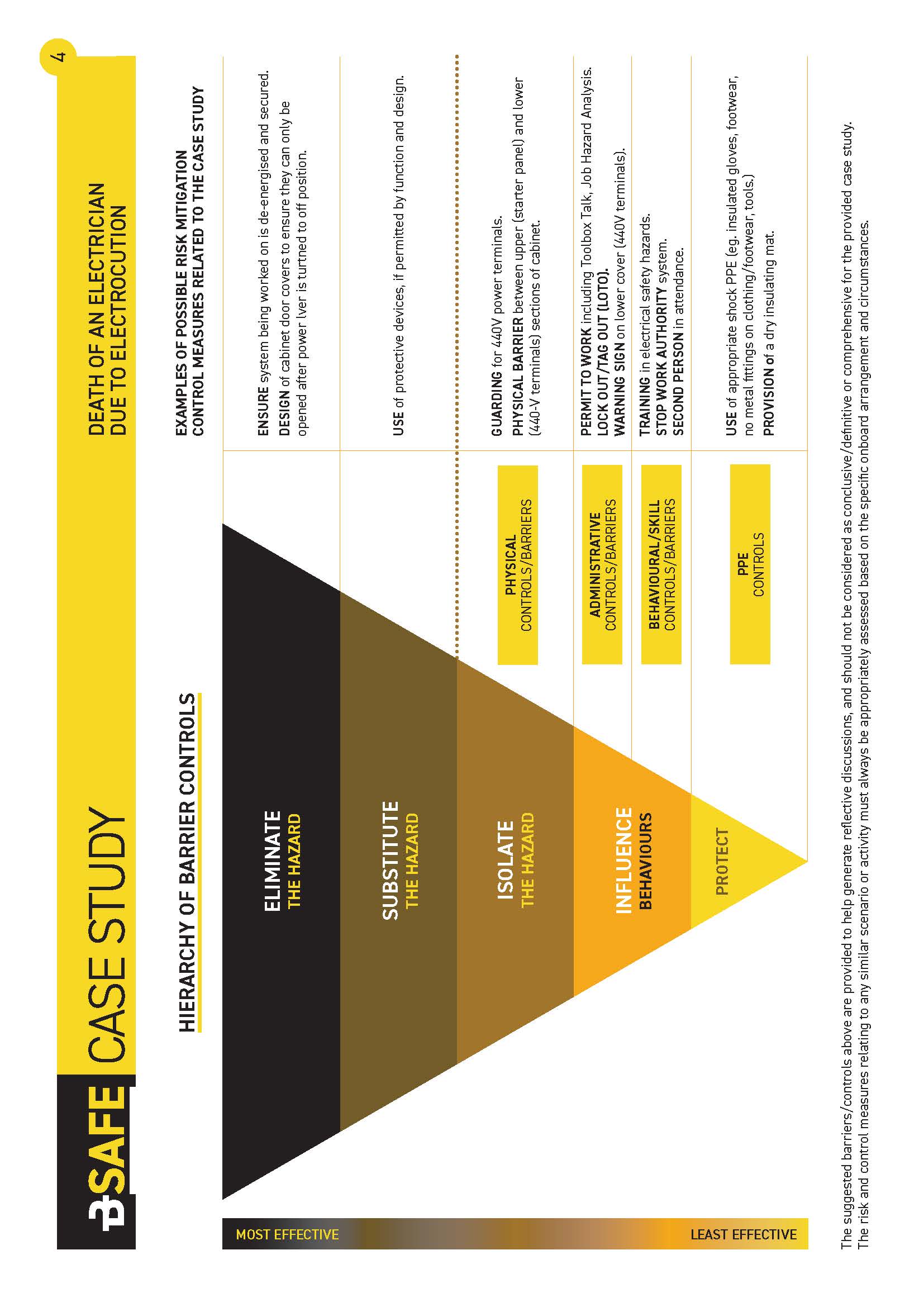 The investigation found that all other starter cabinets in the ship’s engine room had a physical divider between the contactor and power supply sections. The cabinet in which the electrician was working in did not have such a physical barrier. The other cabinets also had guarding installed over any exposed terminals to prevent inadvertent contact. Any of these barriers would have prevented the incident from occurring. The investigation reported that all high-voltage electrical panels installed on ships managed by the company were subsequently inspected to ensure that adequate physical barriers were in place. Furthermore, a system for preventing access to high voltage panels without proper authorisation would have provided an additional safety barrier to prevent this incident from occurring.