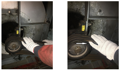 During maintenance of air handling unit fan in air condition room, Electrician's left hand small finger was stacked and snapped between fan pally and V-Belt.