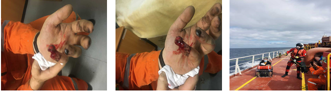 Immediately after, Master was informed about relevant injury and first aid had been applied in order to take bleeding under control and to prevent disinfection.