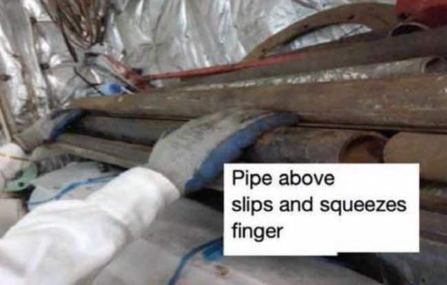 He attempted to rearrange the misplaced pipe, but as he was doing so, another pipe stowed above slipped from the pile and crushed his index finger against the pipes below.